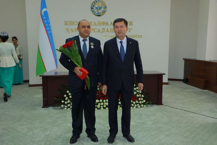 Мукофотларни Президент номидан Самарқанд вилояти ҳокими Эркинжон Турдимов топширмоқда.