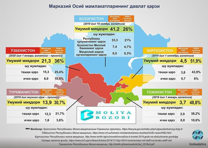 Халқаро валюта фонди ва Марказий Осиё давлатлари молия вазирликлари давлатларнинг умумий қарзлари миқдорини эълон қилди.