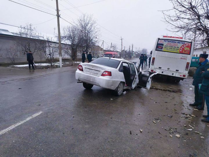 "Нексия" 30 нафар йўловчиси бўлган автобус билан тўқнашди