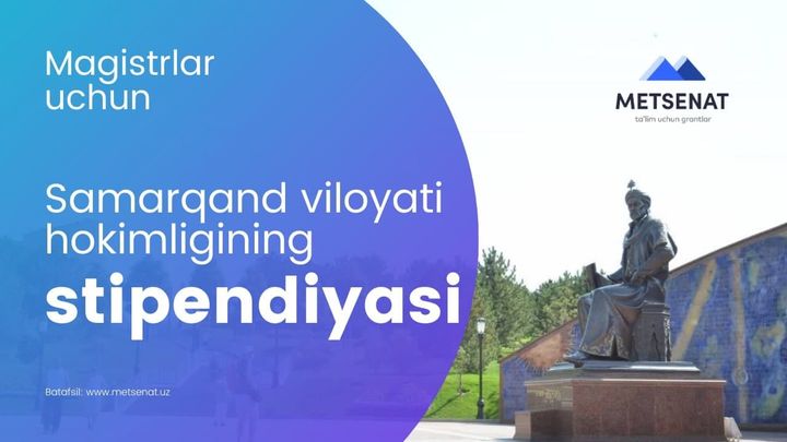 Самарқанд вилояти ҳокимлиги магистратура босқичида таҳсил олаётган талабалар учун стипендия жорий этди. Стипендия дастурида Самарқанд вилоятида жойлашган олий таълим муассасаларида ўқиётган Ўзбекистон Республикасининг барча фуқаролари иштирок эта олади.