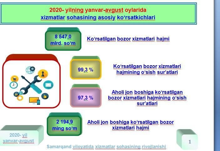 Дастлабки маълумотларга кўра, 2020 йилнинг январь-август ойлари давомида кўрсатилган бозор хизматлари ҳажми 8547,0 миллиард сўмга етди. Унинг номинал ҳажми 673,9 миллиард сўмга ошди. Таққослама эквивалентда ўтган йилнинг мос даврига нисбатан ўсиш суръати 99,3 фоизни ташкил қилди.