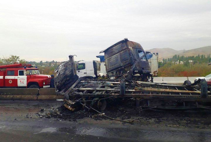 Маълумотларга кўра, давлат рақами 01 423 GGA бўлган “Mercedes-Benz” русумли юк машинаси ёмғирли об-ҳаво шароитида руль бошқарувини эплай олмай, йўлни ажратувчи бетон тўсиққа бориб урилган. Зарб натижасида келиб чиққан ёнғин сабабли юк машинаси ёниб кетган.