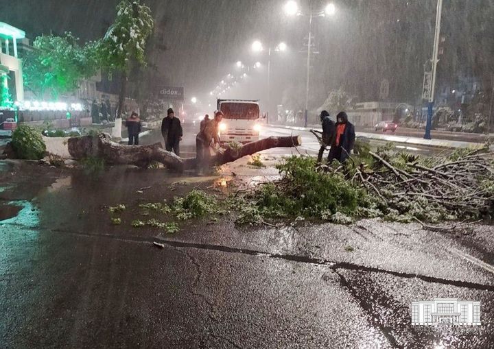 8 апрелдан 9 апрель кунига ўтар кечаси Тошкентда ҳам кучли қор ёғиши оқибатида кўплаб дарахтларнинг синишига, электр тармоқларида узилишлар ва газ қувурларининг шикастланишига сабаб бўлди.