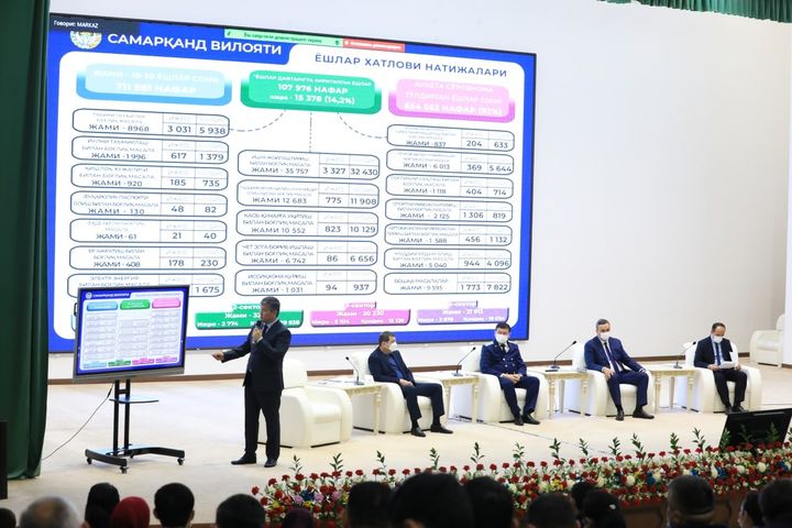 Samarqand shahridagi yoshlar markazida viloyat sektorlari rahbarlarining hisoboti tinglandi. Yoshlar o‘zlarini qiynab kelayotgan muammolar va takliflarni o‘rtaga tashladi. Ularning yechimi bo‘yicha mutasaddilarga vazifalar berildi.