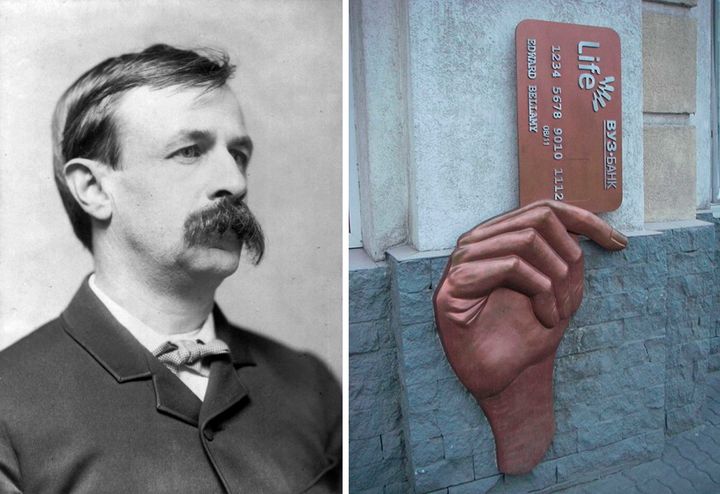 1888 yilda uncha taniqli bo‘lmagan amerikalik yozuvchi Edvard Bellamch «Ortga nazar» utopik romanida 2000 yilda amerikaliklar turmushi qanday bo‘lishini tasvirlaydi. Bashoratchi yozuvchining karomaticha, shu davrga kelib AQSh fuqarolari ish haqini naqd emas, maxsus kartalar yordamida ola boshlaydi. Ana shunday kartalarga ega mamlakat fuqarolari sanoat mollari, uy-ro‘zg‘or, maishiy buyumlari, oziq-ovqat mahsulotlarini Amerikaning istalgan joyida olishlari mumkin.