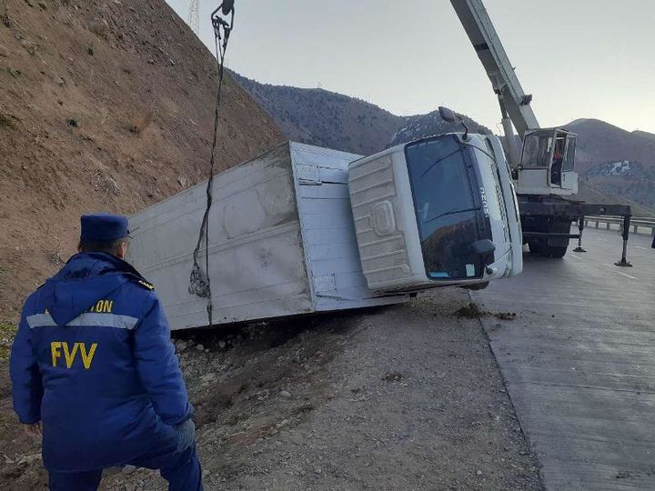 Qamchiq dovonida yuk mashinasi ag‘darilib ketdi
