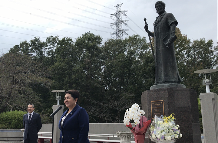 Tanzila Norboyeva Yaponiyada Alisher Navoiy haykali poyiga gul qo‘ydi