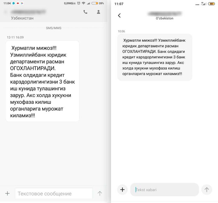 Қисқаси, пандемия сабаб кимдир 3 ой, кимдир 5 ой кредит қарздорлигини тўлай олмади. Президентимизнинг юқоридаги фармонига асосан, пандемия даврида кредит қарздорликни тўлай олмаганларнинг қарзи узайтирилиши керак эди. Аммо шу кунларда Қорасув массивида истиқомат қилувчи айрим қарздорлиги бор фуқароларга банк томонидан огоҳлантириш хати СМС тарзида келяпти. Унда айтилишича, “3 банк иш кунида қарздорликни тўламасангиз, ҳуқуқни муҳофаза қилувчи органларга мурожаат этамиз”, дейилган.