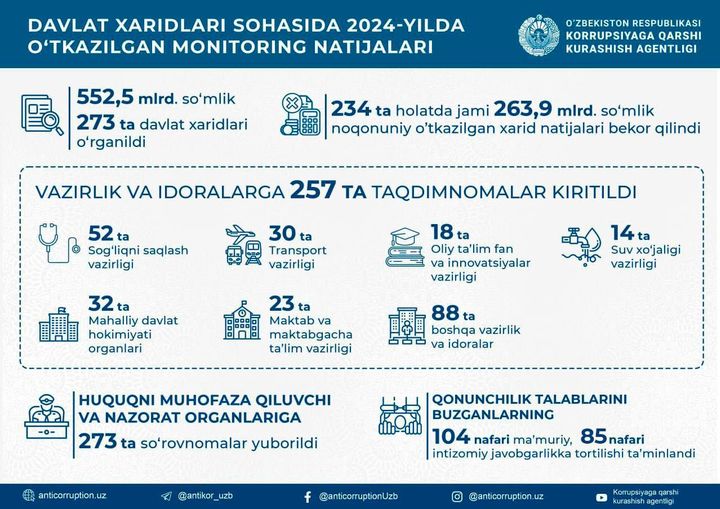 Жумладан, 2024 йилда 552,5 млрд сўмлик 273 та харидлар ўрганилган.