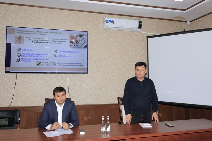 Банк ходимлари, мижозлар ва фуқаролар иштирок этган тадбирда коррупциянинг хунук оқибатлари, унинг жамиятга салбий таъсирлари тўғрисида маълумотлар берилди.