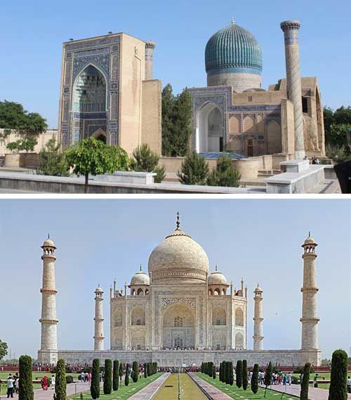 Xo‘sh, dunyoning ikki chekkasidagi ushbu ikki bebaho me’moriy obidani bitta maqolada yoritishimizning sababi nima? To‘g‘ri, maqbaralarning tashqi ko‘rinishida oz bo‘lsa-da, o‘xshashliklar bor: ikkala maqbarada ham asl qabrlar pastki xonada joylashgan. Har ikkala maqbara ham YuNESKO tomonidan ro‘yxatga olingan. Lekin bularning hammasi asosiy sabab emas. Bu ikkala ajoyib arxitektura durdonasi asli kelib chiqishi O‘rta osiyolik, aniqrog‘i, o‘zbekistonlik bo‘lgan temuriylar sulolasi va ularning Hindistondagi davomchisi boburiylar sulolasi hukmdor vakillari tomonidan qurdirilgan. Shu yerda gidlarimiz ushbu faktni ajoyib isboti sifatida imperator Shoh Jahonning otasi bo‘lgan Hindiston hukmdori Jahongir (1605-1627 yillarda hukmdorlik qilgan) tomonidan Samarqandga o‘zining bobokaloni bo‘lgan Amir Temurning maqbarasini restavratsiya qilish uchun juda katta moddiy boylik yuborilganligini aytib o‘tish joiz. Bu fakt, ayniqsa, hindistonlik sayyohlarni lol qoldirgan bo‘lardi.