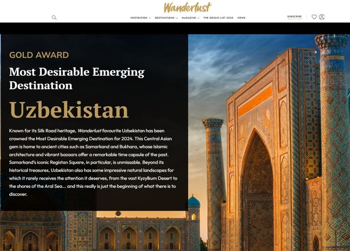 Wanderlust саёҳат журнали ҳар йилги Reader Travel Awards учун дунёдаги энг севимли манзилларга овоз бериш бўйича сўровнома ўтказди. Бу йил 168 минг саёҳатчи 22 турли тоифада овоз берди. Ўқувчилар ўзларининг севимли истиқболли йўналишлари учун ҳам овоз беришган ва Ўзбекистонни энг истиқболли ривожланаётган йўналиш деб эътироф этишган.