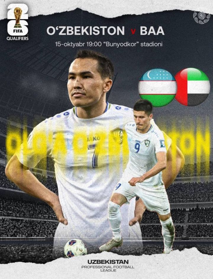 Бугун, 15 октябрь куни Тошкент шаҳридаги “Бунёдкор” стадионида “ЖЧ-2026” Осиё қитъаси гуруҳ босқичининг 4-турида Ўзбекистон – БАА терма жамоалари куч синашади.