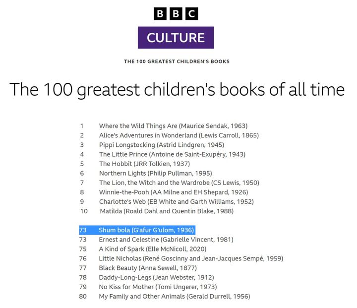 Ғафур Ғуломнинг «Шум бола» асари BBC’нинг «Барча даврларнинг 100 та энг буюк болалар китоблари» рўйхатига киритилди