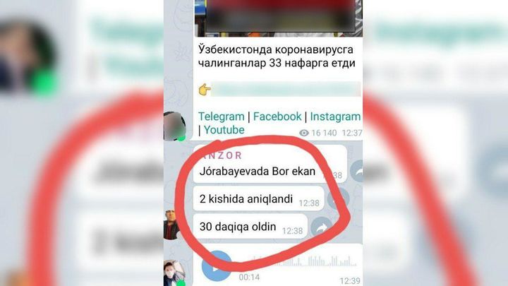 Joriy yilning 20 mart kuni Surxondaryo viloyati IIB tezkor qidiruv hamkorlik boshqarmasi xodimlari tomonidan olib borilgan tezkor-texnik tadbirlar davomida telegram messenjeridagi "@GroupSurxondaryo" kanalining foydalanuvchisi “A N Z O R” deb nomlangan profil egasi 20 mart kuni soat 12:38 da "@GroupSurxondaryo" guruhiga koronavirus haqida, ya’ni “Jo‘rabayevada Bor ekan 2 kishi aniqlandi 30 daqiqa oldin” degan mazmundagi odamlarni chalg‘ituvchi, jamiyatda vahima uyg‘otuvchi yolg‘on ma’lumot tarqatganligi ma’lum bo‘ldi.