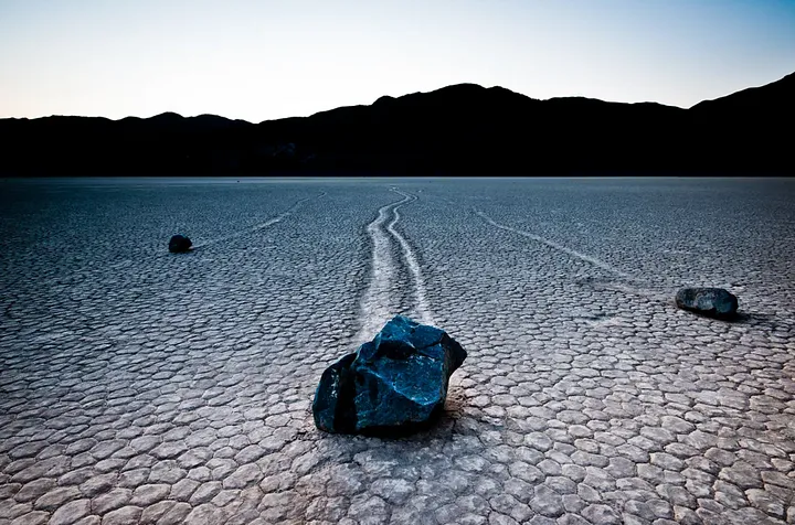 Сирли ҳаракатланувчи йирик тошлари чангли чўлда узоқ излар қолдирадиган “Плейя Рэйстрэк” қуруқ кўли Калифорниядаги Ўлим водийси миллий боғида жойлашган.