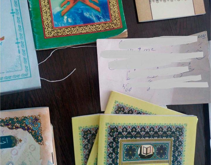 Воқеа жойидан 7 дона араб ёзувидаги диний адабиётлар, 7 дона дафтарлар, 6 дона варақалар ашёвий далил тариқасида ҳужжатлаштириб олинди.
