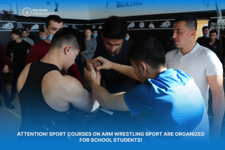 “Ipak yo‘li” turizm va madaniy meros xalqaro universitetining sport klubi qoshida maktab o‘quvchilarini armrestling sport turi bo‘yicha iste’dodlarini yuzaga chiqarish, ular orasidan sport sohasida alohida iqtidor egalarini saralab olish maqsadida haftada 2 marta mashg‘ulotlar tashkil etilgan.