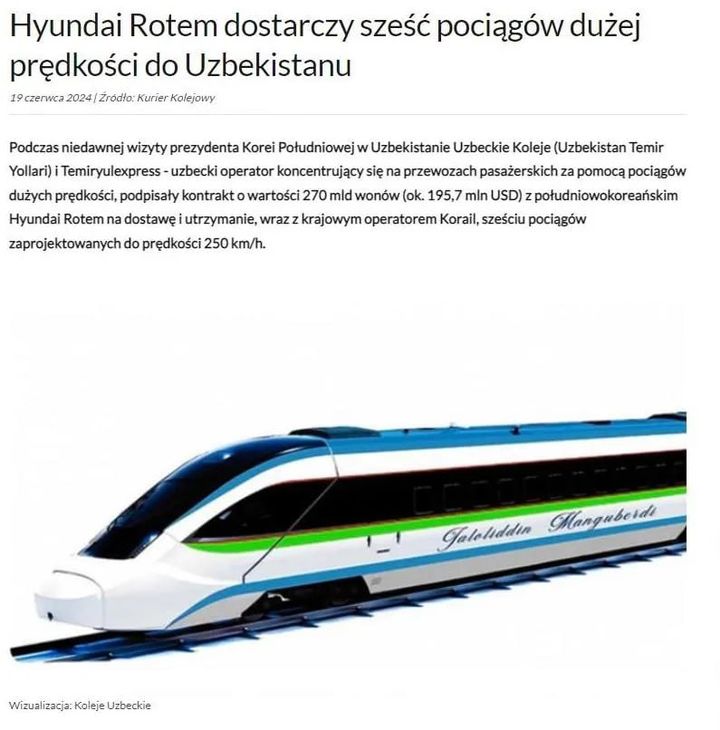 Польшанинг "Kurier Kolejowy" журнали сайтида "Hyundai Rotem" компанияси Ўзбекистонга олтита тезюрар поезд етказиб беради" сарлавҳали мақола эълон қилинди.