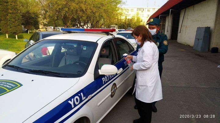 Шифокорлар хизмат хоналарини дезинфекция қилиш билан бирга хизматга чиқаётган ва хизматдан қайтаётган патруль автомобилларига ҳам вирусга қарши воситалар билан ишлов беришаяпти. Бу ишлар оралиғида ходимлар амал қилиши лозим бўлган асосий талаблар ҳам уларга тушунтириб борилмоқда.