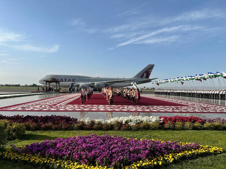 Ikki davlat bayroqlari va gullar bilan bezatilgan aeroportda Qatar Amiriga xalqimizga xos yuksak mehmondo‘stlik ko‘rsatildi. Boy milliy madaniyat va san’atimiz namunalari namoyish etildi. Kuy-qo‘shiqlar ijro qilindi.