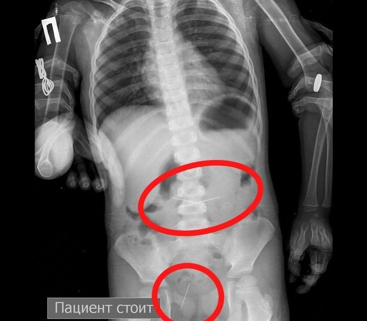"Sputnik Kazaxstan" xabar berishicha, ona 3 yoshli farzandini kasalxonaga olib kelgan. Rentgenda bolaning oshqozonida 4 ta tikuv ignalari borligi aniqlangan.