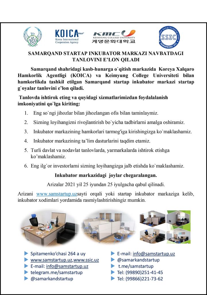 Samarqand shahridagi kasb-hunarga o`qitish markazida Koreya Xalqaro Hamkorlik Agentligi (KOICA) va Keimyung College Universiteti bilan hamkorlikda tashkil etilgan Samarqand startap inkubator markazi startap g`oyalar tanlovini e’lon qiladi.