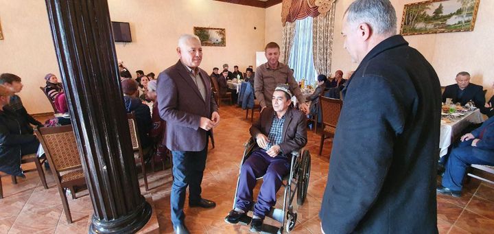 Шундан сўнг туман ҳокимлиги томонидан ногиронлиги бўлган 16 нафар фуқарога ногиронлик аравачалари топширилди. Иштирокчиларга байрам дастурхони ёзилди.