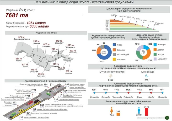 Унга кўра, йилнинг ўтган 10 ойи мобайнида жами 7 минг 681та ЙТҲ рўй берган бўлиб, уларда 1 минг 964 киши ҳаётдан кўз юмган бўлса, 6 минг 886 киши турли даражада тан жароҳати олган.