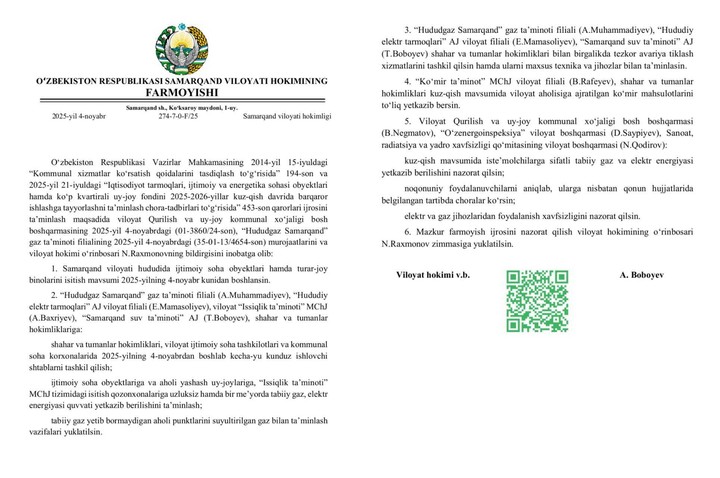 Ҳужжатга кўра, шаҳар ва туманлар ҳокимликлари, вилоят ижтимоий соҳа ташкилотлари ва коммунал соҳа корхоналарида шу йилнинг 4 ноябридан кечаю кундуз ишловчи штаблар ташкил қилиш белгиланган.