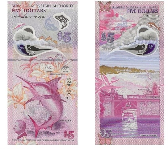 Пуллари рангоранг ва кўзни қамаштиради. Лекин пушти ва бинафша рангга бўялган беш долларлик пул бирлигида Бермуддаги машҳур океан қудрати ва балиқ-спорт ови рамзи кўк марлин балиғи тасвирланган. Орқа томонида дунёдаги энг кичик кўприк сифатида танилган Сомерсет кўприги жойлашган. У 2024 йилнинг "Йил банкноти" деб топилган.