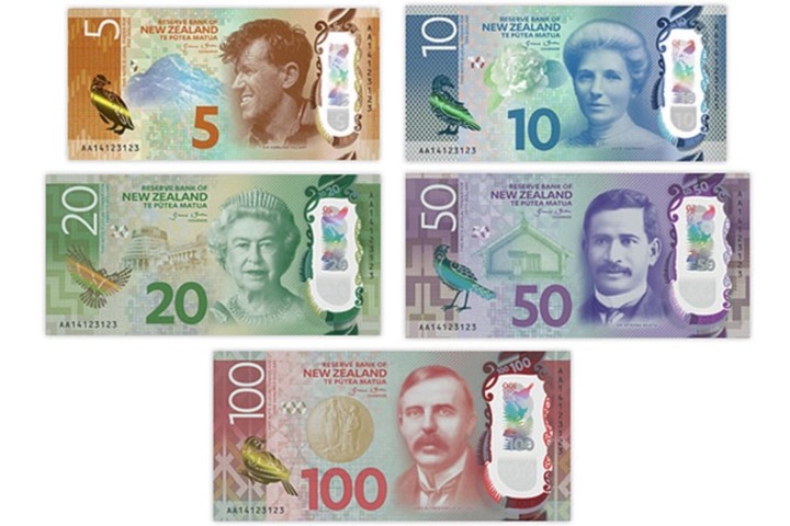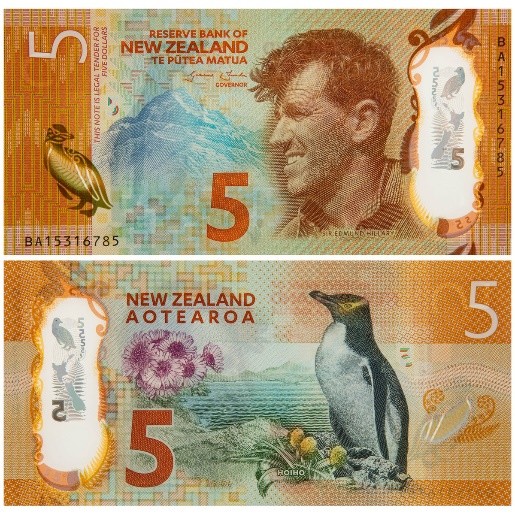Олд томонида Эверест тоғини забт этган биринчишахс, жаноб Эдмунд Хиллари тасвирланган 5 долларлик полимер банкнот 2015 йилда 20 та давлат иштирок этган танловда "Йил банкноти" дебтопилган. Ушбу купюранинг ўнг томонида Янги Зеландия табиий меросининг рамзларидан бирипингвин қуши тасвирланган.