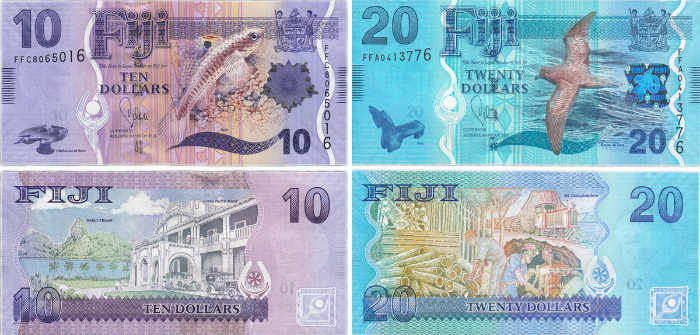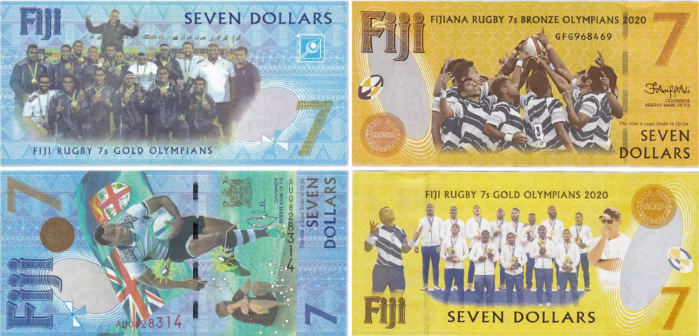 Мамлакат миллий терма жамоасининг 2017йилдаги Рио-де-Жанейро Олимпиадасида регби еттилиги мусобақасидаги ғалабасидан сўнгмуомалага чиқарилган 7 долларлик эсдалик пул белгилари алоҳида ўрин эгаллайди. Иккинчи нашр2022 йилда Токио Олимпиадасидаги олтин медальшарафига чиқарилди. Ушбу банкнотлар фақаттўлов воситаси бўлибгина қолмай, балки мамлакатнинг спорт рамзига ҳам айланишга улгурди.