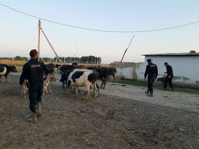 Суратларда Миллий гвардия ходимларининг чорва молларини сув босган ҳовлилардан ва майдонлардан олиб чиқаётганини ҳамда уларни хавфсиз жойларга ҳайдаб кетаётганини кўриш мумкин.