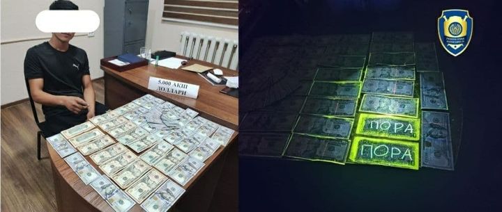 Tadbir davomida Sh.T. Chimkent tibbiyot instituti talabasidan 5 000 dollarni firibgarlik yo‘li bilan olgan vaqtida ashyoviy dalillar bilan ushlangan.