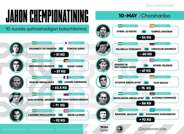Bugun Toshkent vaqti bilan soat 14:00 dan boks bo‘yicha bo‘lib o‘tayotgan jahon chempionatining chorak final bahslari boshlanadi. Ushbu bosqichda kubalik bokschilar ko‘proqni tashkil etmoqda - 12 nafar, undan keyingi o‘rinda o‘zbekistonliklar - 11 nafar. Shuningdek, Rossiyadan 8 nafar, Qozog‘istondan 7 nafar bokschi chorak finalda o‘z raqiblari bilan ringga ko‘tariladi.