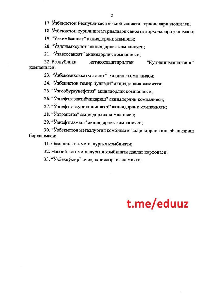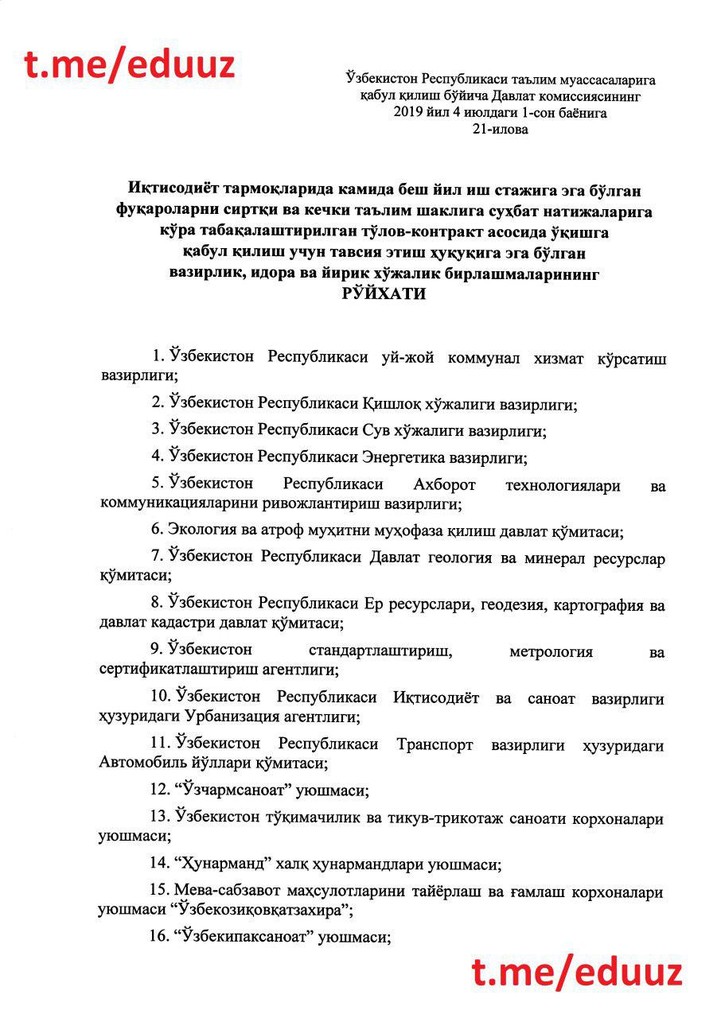 Davlat qabul komissiyasining qarori bilan iqtisodiyot tarmoqlarida kamida 5 yil ish stajiga ega bo‘lgan fuqarolarni sirtqi va kechki ta’lim shakliga suhbat natijalariga ko‘ra tabaqalashtirilgan to‘lov-kontrakt asosida o‘qishga qabul qilish tartibi, shuningdek, tavsiya etish huquqiga ega bo‘lgan vazirlik, idora va yirik xo‘jalik birlashmalarining ro‘yxati tasdiqlandi (ro‘yxat pastdagi suratda). Bu haqida Oliy va o‘rta maxsus ta’lim vazirligi xabar bermoqda.