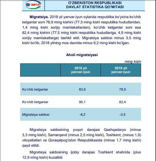 Migratsiya saldosi minus 3,5 ming kishiga yetdi va 2018 yilning shu davriga nisbatan minus 6,2 ming kishini tashkil etdi.