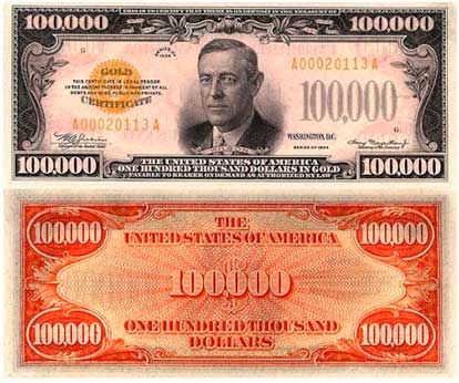 Ammo 1929 yildan 1945 yilgacha 500, 10 000 va hatto 100 000 dollarlik kupyuralar bo‘lgan. Ushbu apelsin rangli banknotalar faqat maxsus ijroiya organlari o‘rtasidagi hisob-kitoblar uchun chiqarilgan, xolos.