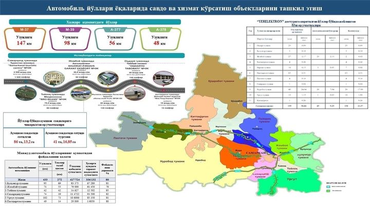Xalqaro ahamiyatga ega yo‘llar bo‘yida umumiy qiymati 436,3 mlrd. so‘mlik 140 ta loyiha 85 gektar yer maydoniga joylashtirilishi natijasida 1 874 nafar yangi ish o‘rinlari yaratiladi.