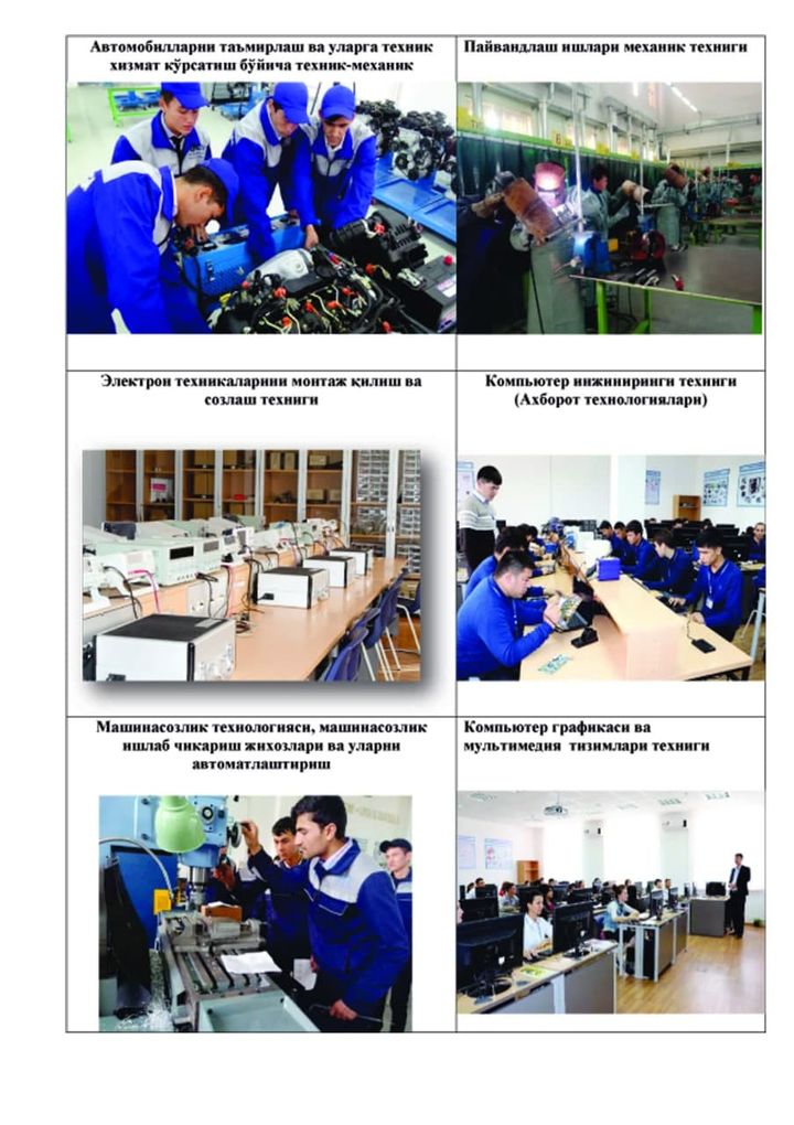 - Kompyuter injiniringi texnigi (Axborot texnologiyalari) (Wyeb dasturchilar, kompyuterlarga texnik xizmat ko‘rsatuvchi ustalar, tarmoq operatorlari, videokuzatuv moslamalarini o‘rnatuvchilar va ularga texnik xizmat ko‘rsatuvchilar, ofis ishlari operatori, 1C buxgalteriya, SMM marketingini yurituvchilar, video va fotomontajchilar, reklama gif animatorlari).