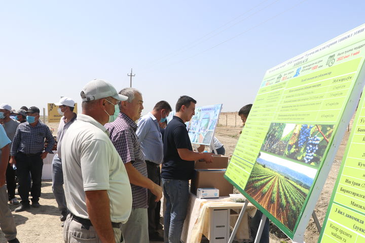 - Bir necha fermer xo‘jaliklarini birlashtirib, klaster tashkil qildik, - deydi “Shohjahon” uzumchilikka ixtisoslashgan klaster korxonasi rahbari Dilbar Jalilova. – Umumiy yer maydonimiz 455 gektarni tashkil etadi. Maqsadimiz eksportbop uzumlar yetishtirib, oz yerdan ko‘p daromad qilish. Qiymati 30 milliard so‘mlik loyiha to‘liq amalga oshirilgach, gektaridan 6 ming tonna hosil olish niyatidamiz, uning 3 tonnasi eksport qilinadi. 2024 yilga kelib 820 kishi ishli bo‘ladi.