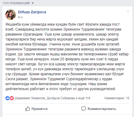 Шу заҳоти мендан яшаш манзилим ва телефонимни сўраб хабар келди. Ўша куни кечқурун, яъни 25 февраль куни кеч соат 6 ларда ниҳоят свет келди. Бугун эса шаҳар электр тармоқларидан икки марта телефон қилиб, уч кун давомида электр тармоғидаги узилишлар учун узр сўрашди. Ҳоким аралашгани учун бизнинг муаммомиз ҳал бўлди! Сизга раҳмат, Эркинжон Турдимов! Сурхондарёликлар у ердан кетганингизда нега йиғлаганини энди тушундим. Наш ҳоким дейтвительно работает и этого требует от других руководителей.