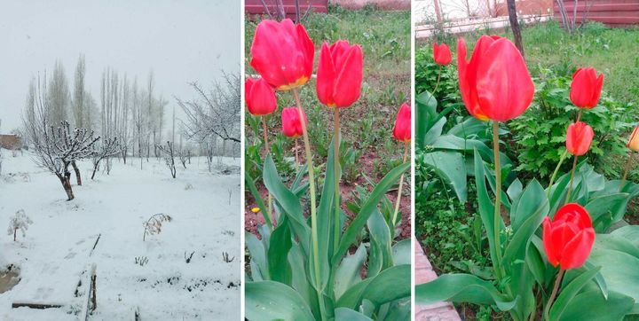 “1 aprel kuni tumanimizning bir tomonida qor yoqqan bo‘lsa, yana bir tomonida yomg‘ir, bir tomonida esa bulutli havo va yana bir chekkasida bahordan darak bo‘lgan tog‘ lolasini ko‘rdim”, - deydi O‘ktam Toshboyev. — Dehqonobod tumanida bir vaqtning o‘zida to‘rt faslni kuzatish mumkin. Demakki, O‘zbekistonimiz jannatmonand diyor!