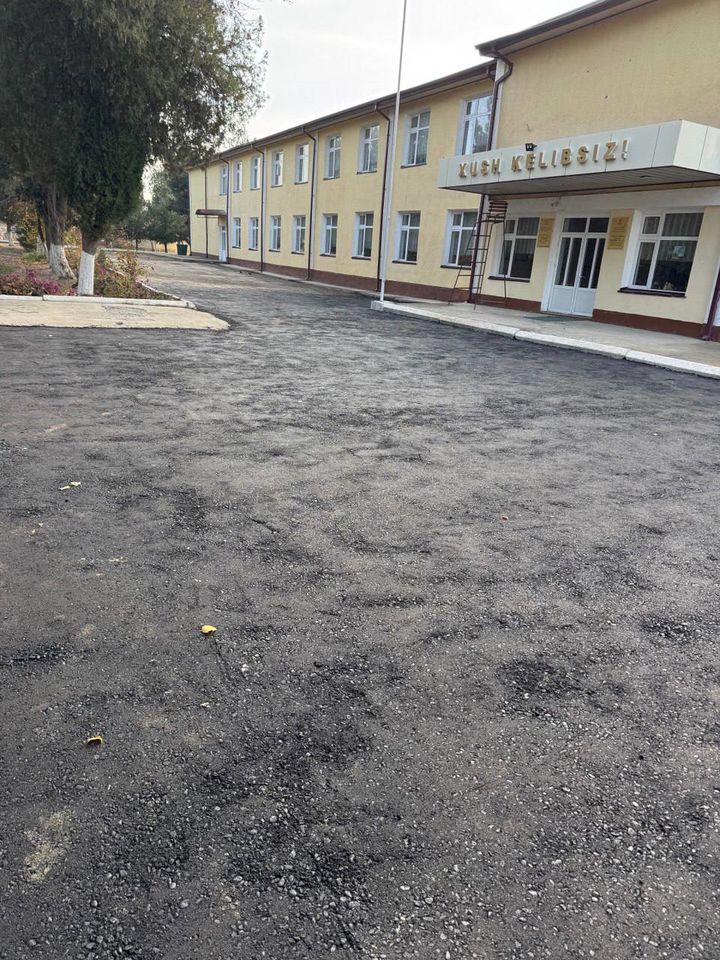 Deputat va tadbirkor Mizrob Toshov tomonidan asfalt olib berilib, maktab hovlisidagi yo‘laklar va kirish qismi to‘liq asfaltlashtirildi.