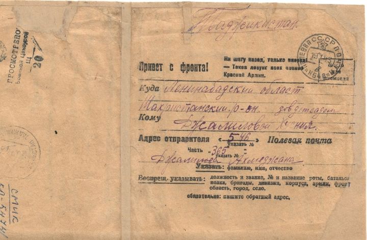 Samarqand davlat muzey-qo‘riqxonasida 80 dan ortiq frontda yozilgan maktublar saqlanadi. Ushbu maktublar Ikkinchi jahon urushida ishtirok etayotgan askarlar tomonidan o‘zlarining yaqinlariga yozilgan bo‘lib, o‘tgan asrning 50-80 yillarida muzey-qo‘riqxona ilmiy xodimlari tomonidan to‘plangan. Quyida maktublardan birini to‘liq holda e’lon qilamiz.
