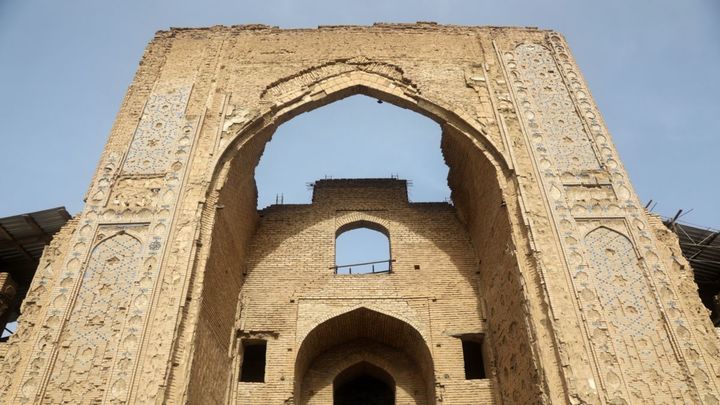 V.L.Viyatkinning manbasida keltirilishicha, majmuaga yaqin hududda yashovchi mulla Ma’ruf (1912 yil) tomonidan devorning zarar yetmagan izora (bezak)larini talon-torojdan saqlab qolish maqsadida yashirincha Yevropa va Amerika muzeylariga bergan. Lekin ko‘p qismi xorijiy kolleksionerlar qo‘liga borib tushgan.