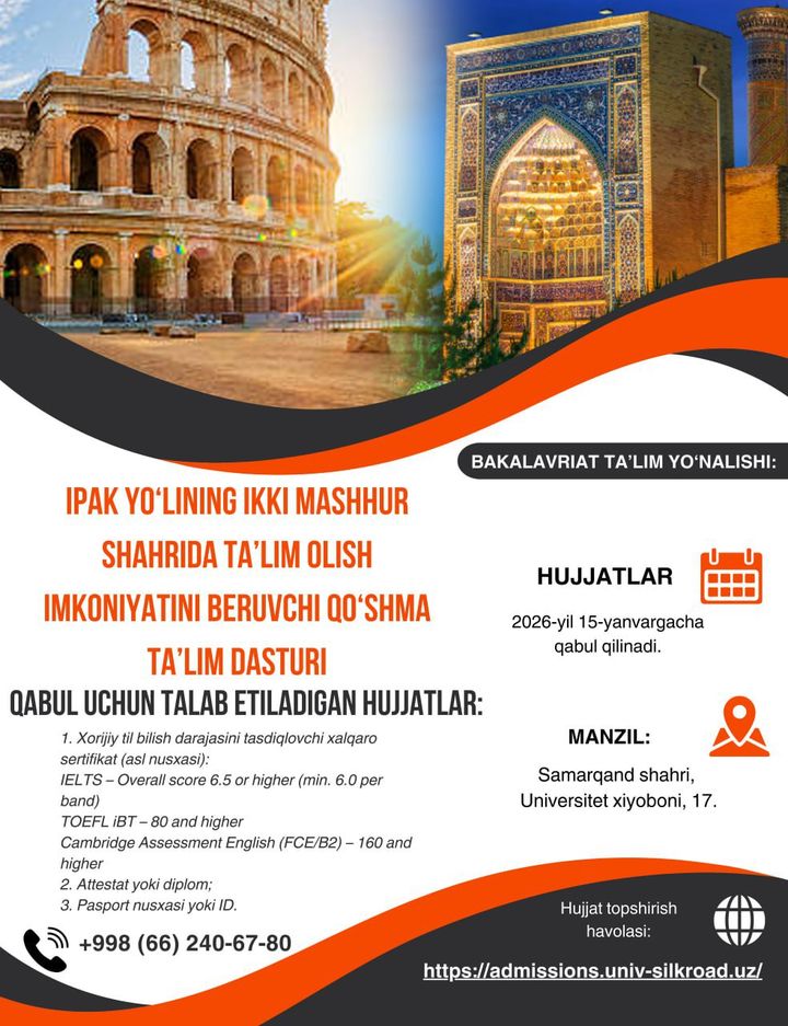 “Ipak yo‘li” turizm va madaniy meros xalqaro universiteti hamda Italiyaning Ca’ Foscari Venice universiteti hamkorligida amalga oshirilayotgan xalqaro qo‘shma ta’lim 2+1 dasturi doirasida to‘lov-shartnoma asosida 2025/2026-o‘quv yili uchun qabul davom etmoqda. Mazkur dastur doirasida talabalar bir vaqtning o‘zida ikki universitet talabasi bo‘lish hamda ikki davlat diplomini qo‘lga kiritish imkoniyatiga ega bo‘ladilar.