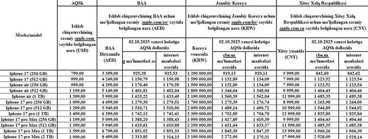 Shu munosabat bilan Bojxona qo‘mitasi “ iPhone 17” rusumidagi mobil qurilmalarni bojxona rasmiylashtirish jarayonida qo‘llanilayotgan bojxona qiymati haqidagi ma’lumotlarni ular eng ko‘p olib kirilayotgan davlatlar kesimida taqdim etib boradi.