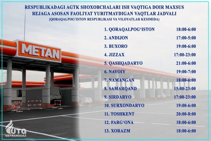"O‘ztransgaz" AJ respublika bo‘yicha “metan-zapravka”larga kiritilgan cheklovlar vaqtini ma’lum qildi.
